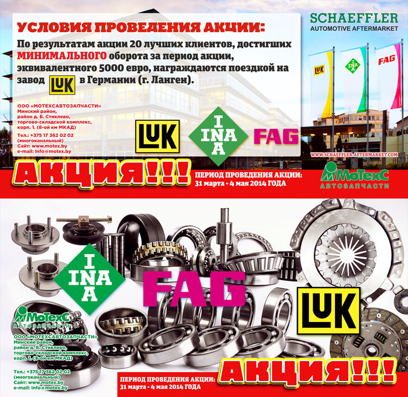 20 лучших клиентов, закупивших за период акции продукции FAG, INA, LUK на сумму, не менее 5000 евро, будут поощрены поездкой на завод LUK в г. Ланген (Германия).