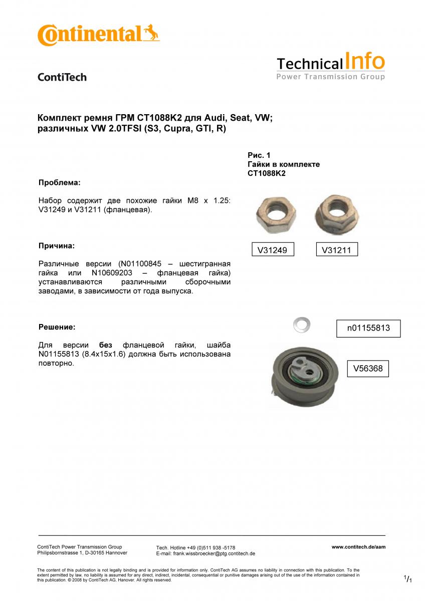 Техническая информация Continental.Комплект ремня ГРМ СТ1088К2 для Audi,Seat,VW; различных VW 2.0TFSI (S3,Cupra,GTI,R)