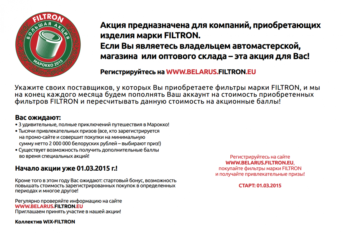 Комапния Filtron проводит акцию. Сроки проведения с 1 марта по 31 июля 2015 года. Подробности -у Вашего менеджера.