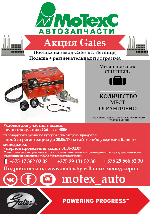 С 1 июня по 31 июля 2017 года участвуйте в акции от Gates и выигрывайте! Купи продукцию Gates на сумму 400€ и получи уникальный код . Больше кодов – больше шансов стать счастливым участником поездки. С 1 июня регистрируйся на сайте . Приз – поездка на завод Gates в г. Легнице, Польша + развлекательная программа .Количество мест ограничено! Успей принять участие! Розыгрыш будет проведен 3 августа! Победители будут выбраны путем генерации случайный чисел в онлайн-трансляции!